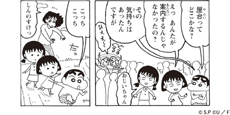 『ちびまる子ちゃん』では、静岡に遊びに来た野原一家とまる子が偶然出会い、しんのすけとまる子がいっしょに迷子に!?
